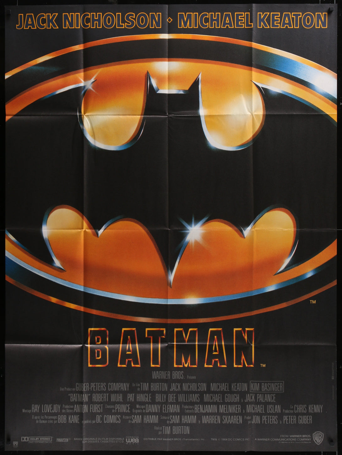 This Batman (1989) Original Folded French One-Panel "Grande" Movie Poster measures 45 1/2" x 62" [116 x 157 cm] and features Tim Burton's rendition of DC Comics' iconic superhero, starring Michael Keaton, Jack Nicholson, and Kim Basinger. The poster shows some edge and fold wear, as well as markings.