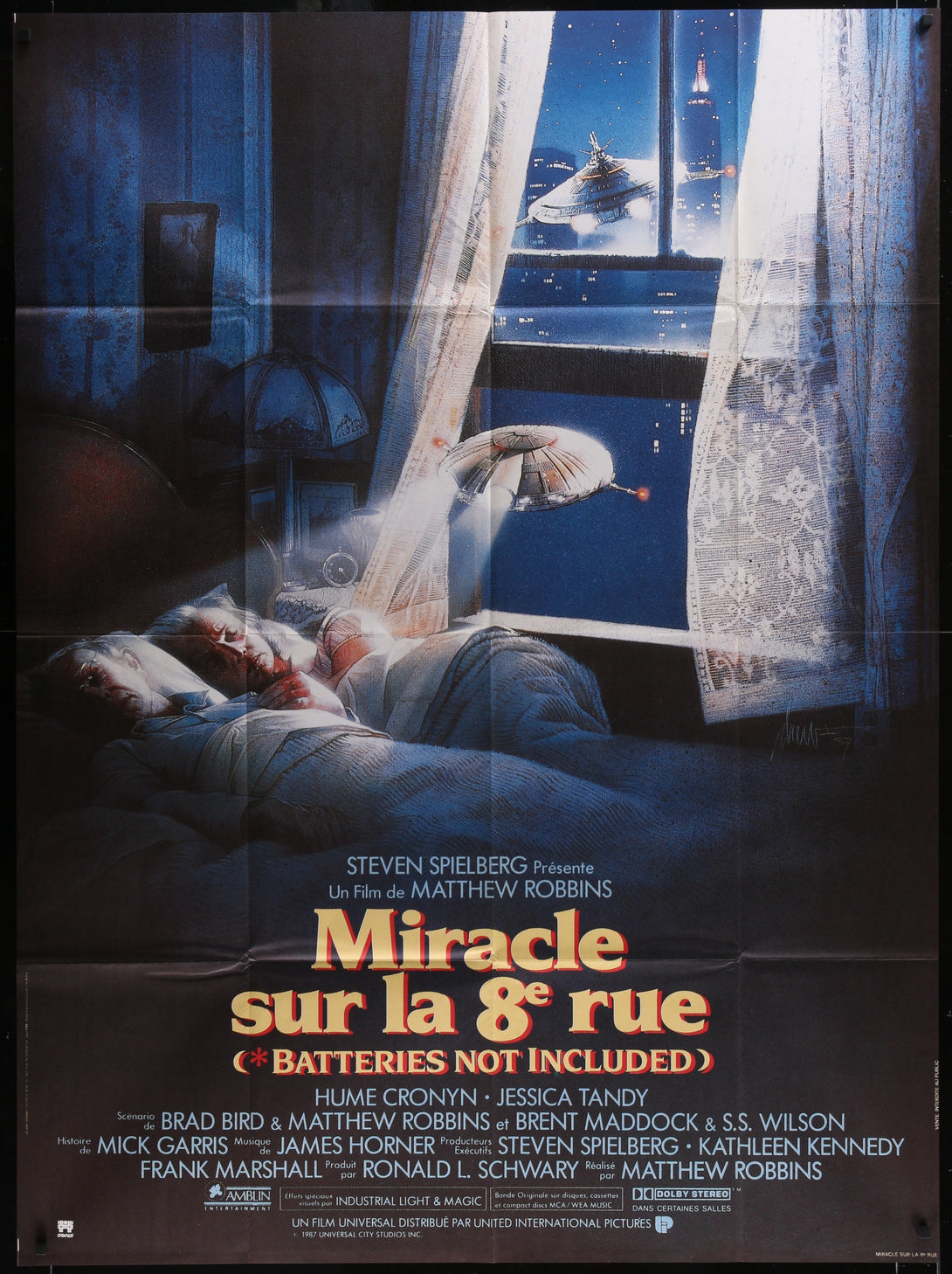 A "Grande" French one-panel movie poster for the 1987 science fiction comedy Batteries Not Included, measuring 45 3/4" x 61 1/2" (116 x 156 cm), by artist Drew Struzan. Shows edge and fold wear, with small holes at some fold meet points.