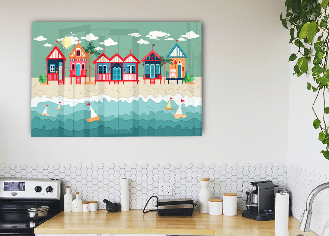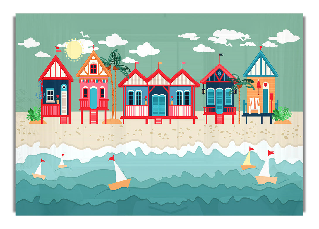 Beach Huts And Sailboats acrylic print, UV printed onto 5mm thick acrylic glass. Comes with everything you need to hang on your wall.