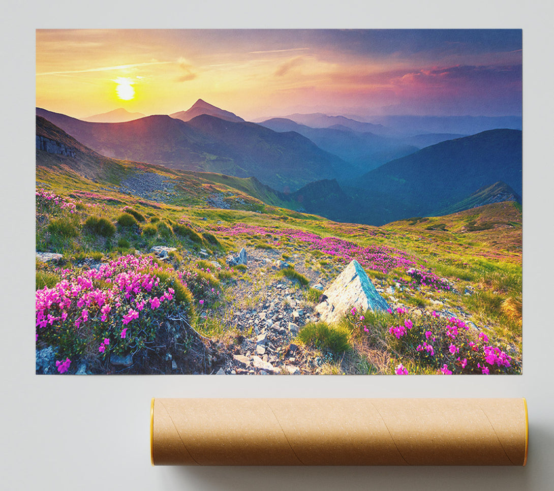 Our Beautiful mountain range and flowers Poster is printed 260 GSM premium lustre paper that offers vibrant colours and exceptional detail.