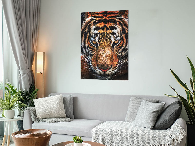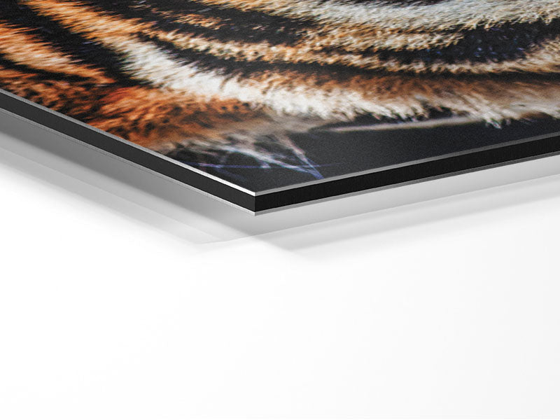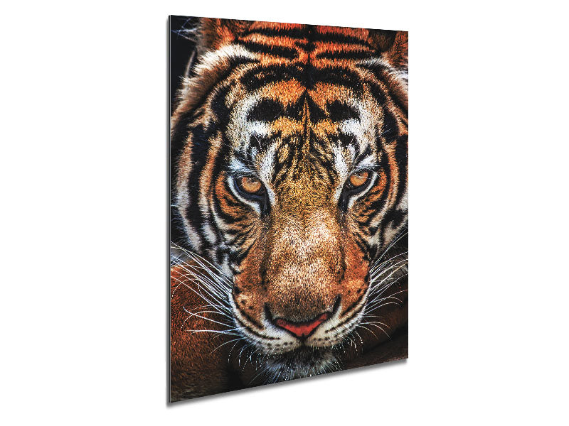 Beautiful Tiger Face Printed on brushed aluminium dibond. A modern way to display art and easy to maintain.