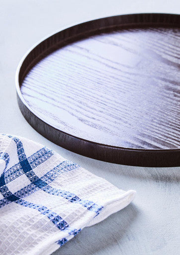 Carved from fir wood, this black large circular tray has a raised rim that adds practicality to the design. Serving multiple purposes, this tray is functional and perfect for serving or using decoratively.