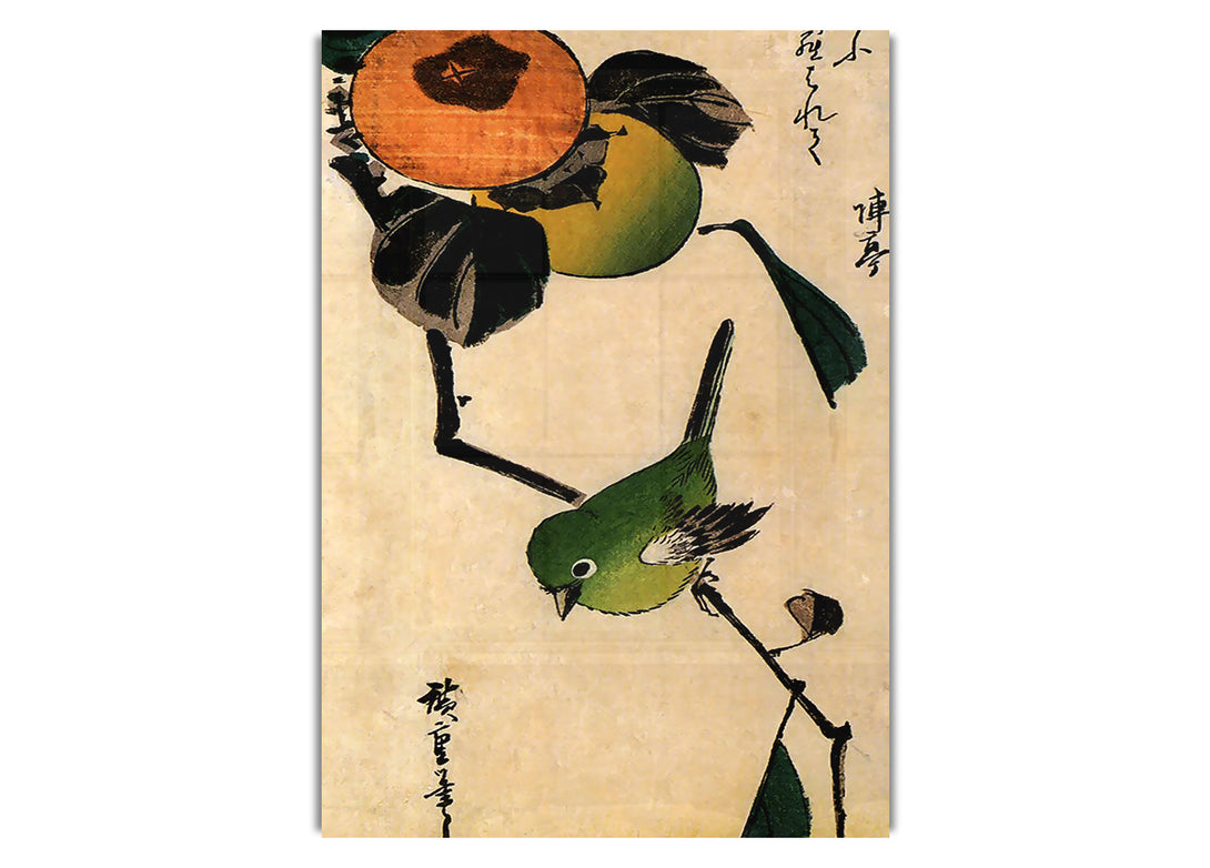 Bird On A Persimmon Tree By Hiroshige acrylic print, UV printed onto 5mm thick acrylic glass. Comes with everything you need to hang on your wall.