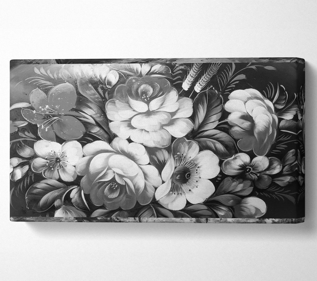 Black And White Flowers wide canvas, printed on coated polyester canvas. Mounted on to a 44mm box frame, ready to hang.