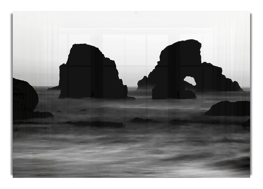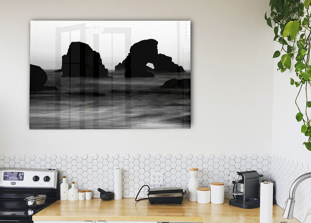 Black And White Ocean Rocks Sunset Canvasb L acrylic print, UV printed onto 5mm thick acrylic glass. Comes with everything you need to hang on your wall.