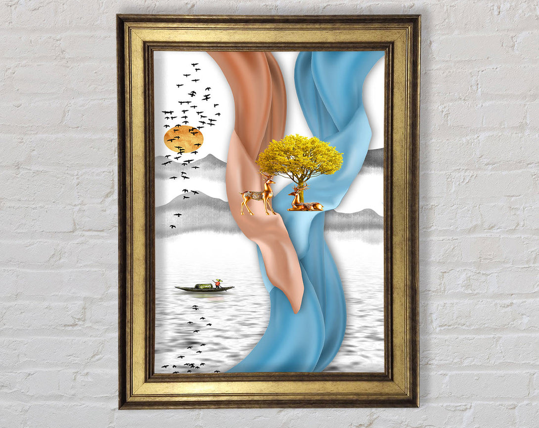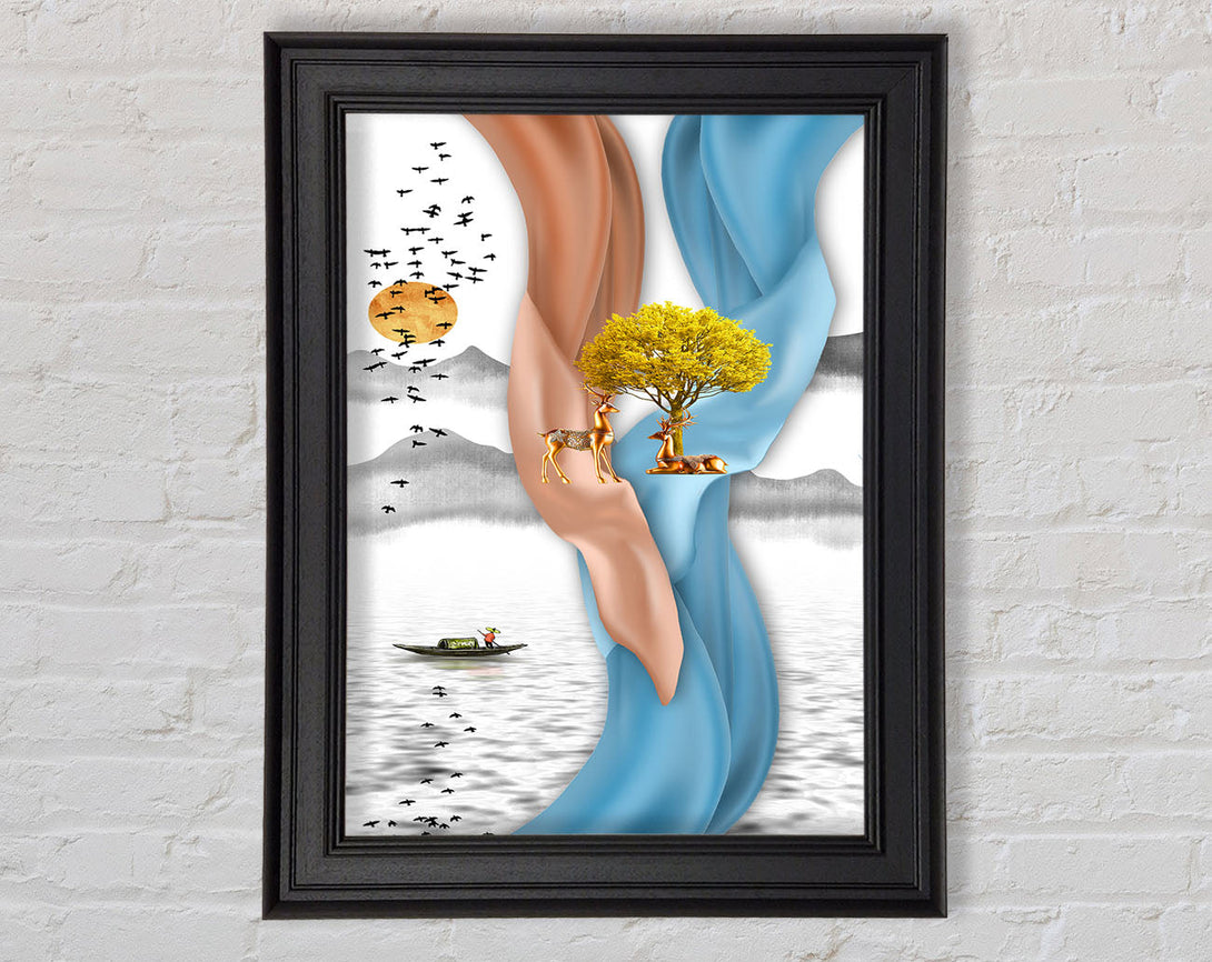 Blue And Orange Swirls With Yellow Tree Framed Print