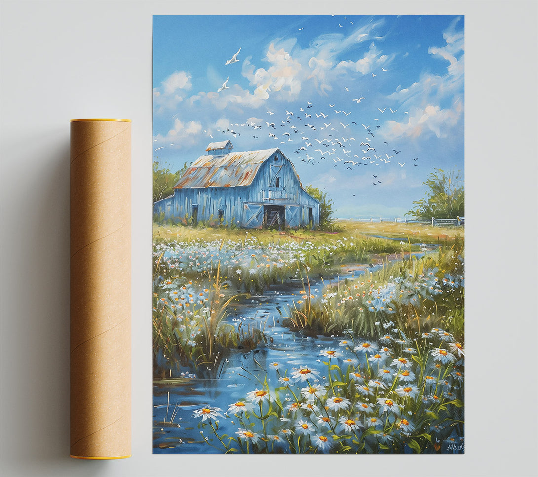 Blue Barn And Daisies Poster