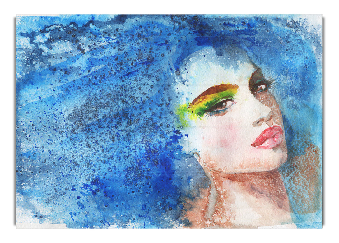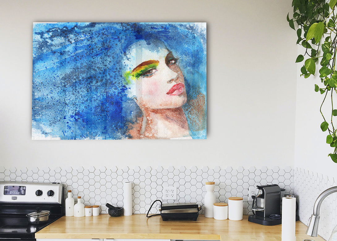 Blue Haired Woman acrylic print, UV printed onto 5mm thick acrylic glass. Comes with everything you need to hang on your wall.