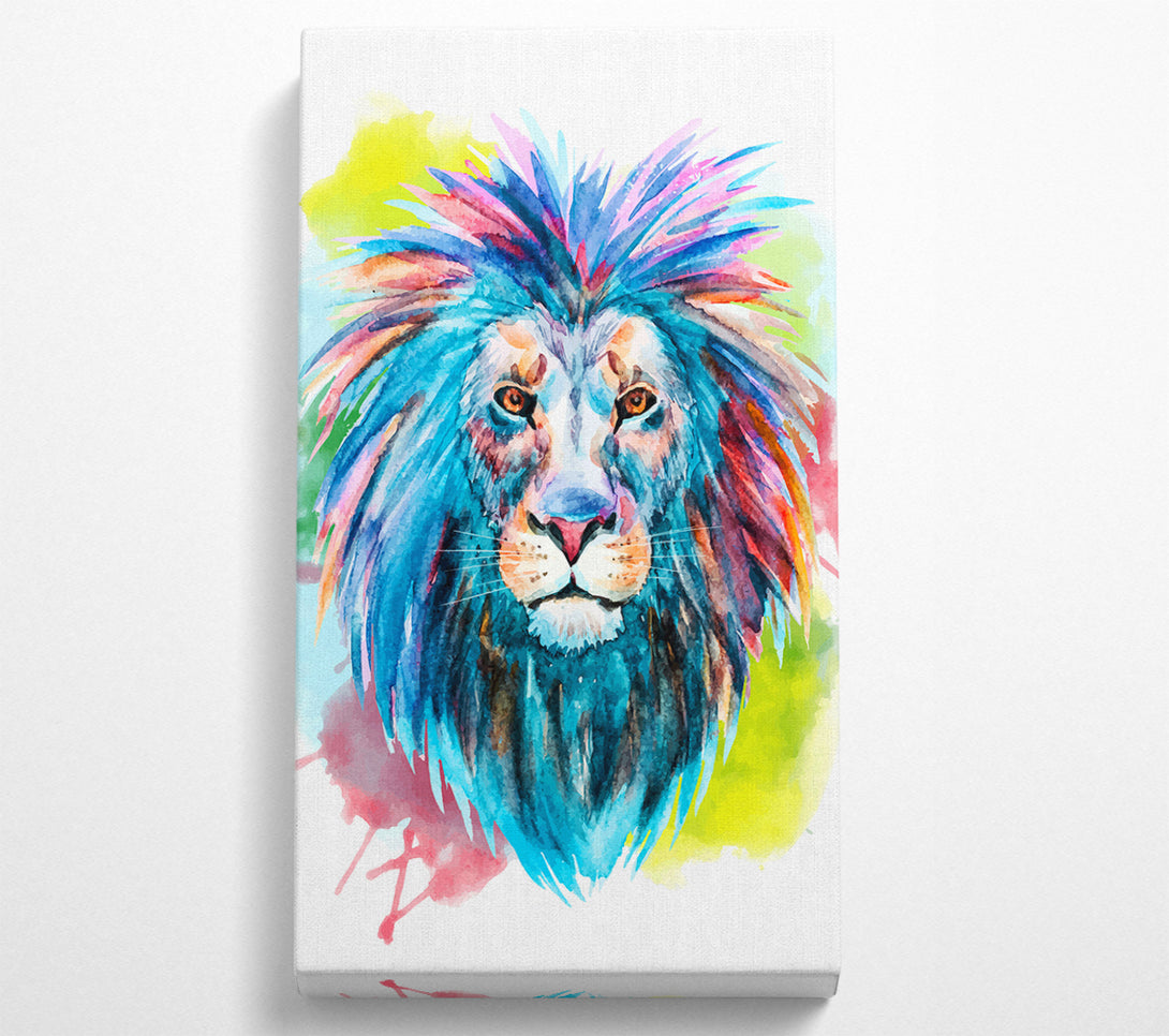 Blue Mained Lion wide canvas, printed on coated polyester canvas. Mounted on to a 44mm box frame, ready to hang.