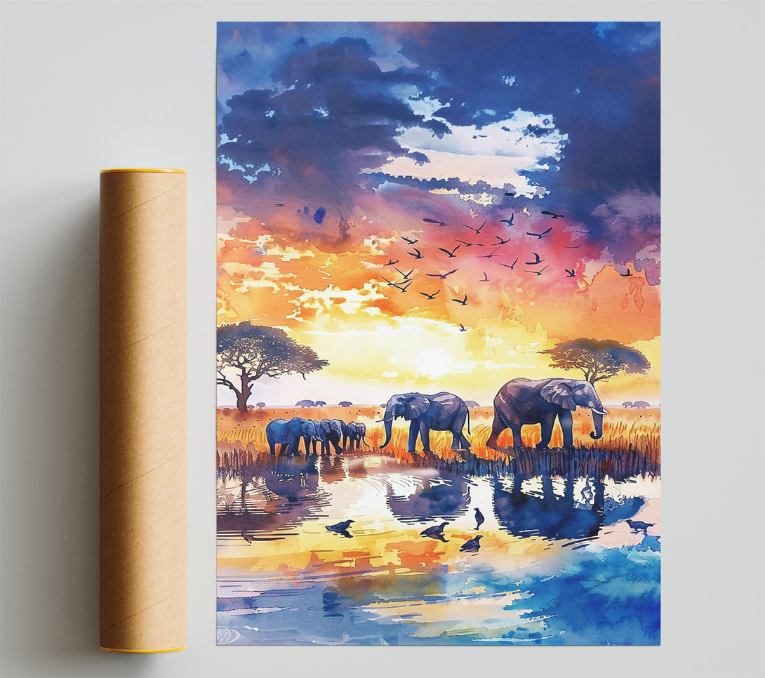 Blue Sunset Elephants Poster