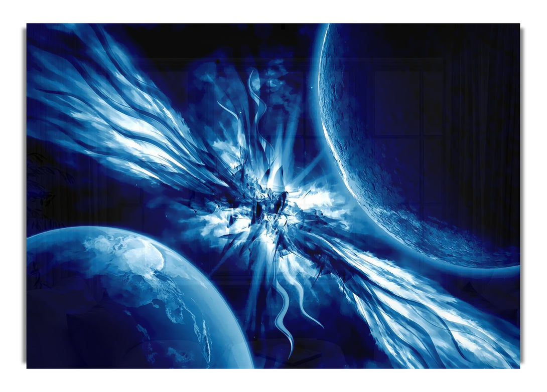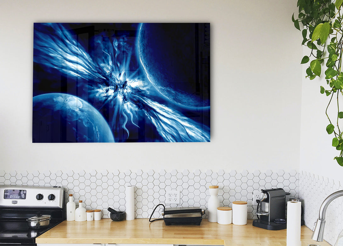 Blue Winged Planets acrylic print, UV printed onto 5mm thick acrylic glass. Comes with everything you need to hang on your wall.