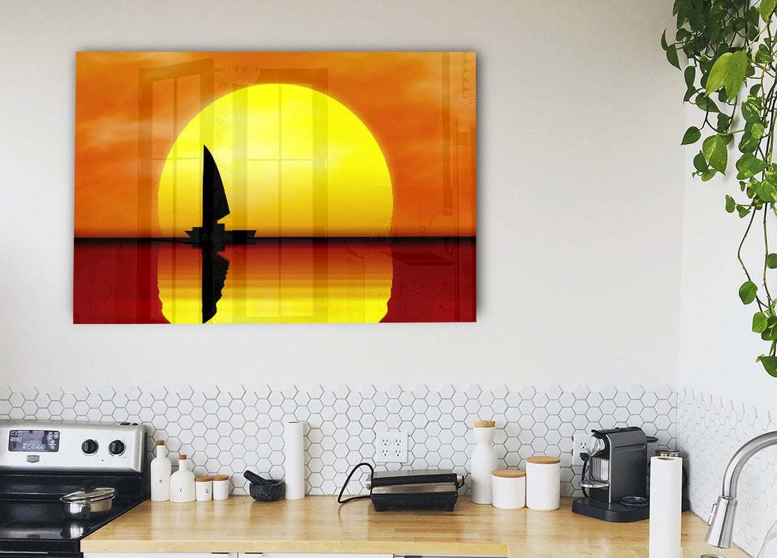 Boat Sailing In The Sunset acrylic print, UV printed onto 5mm thick acrylic glass. Comes with everything you need to hang on your wall.