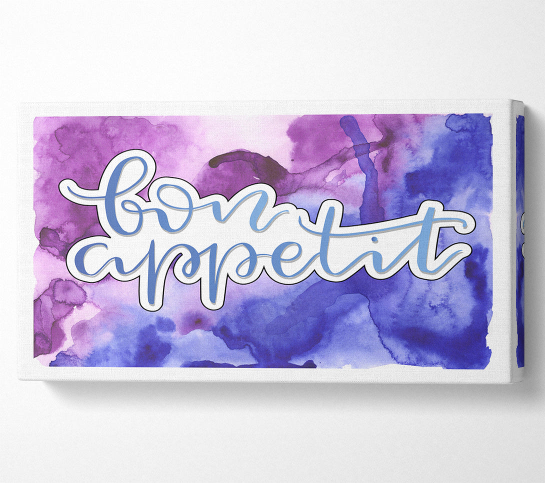 Bon Appetit Saying wide canvas, printed on coated polyester canvas. Mounted on to a 44mm box frame, ready to hang.
