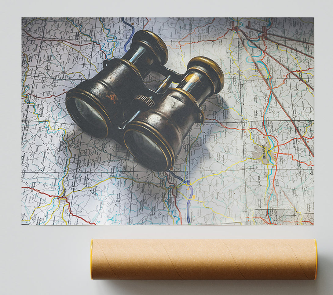 Our Brass Binoculars On Map Poster is printed 260 GSM premium lustre paper that offers vibrant colours and exceptional detail.