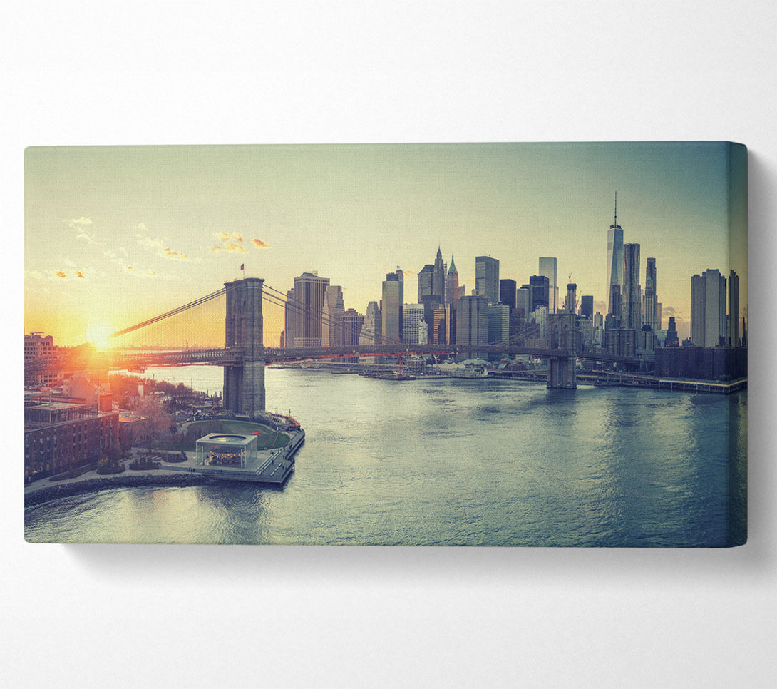 Bridge in New york over the water wide canvas, printed on coated polyester canvas. Mounted on to a 44mm box frame, ready to hang.