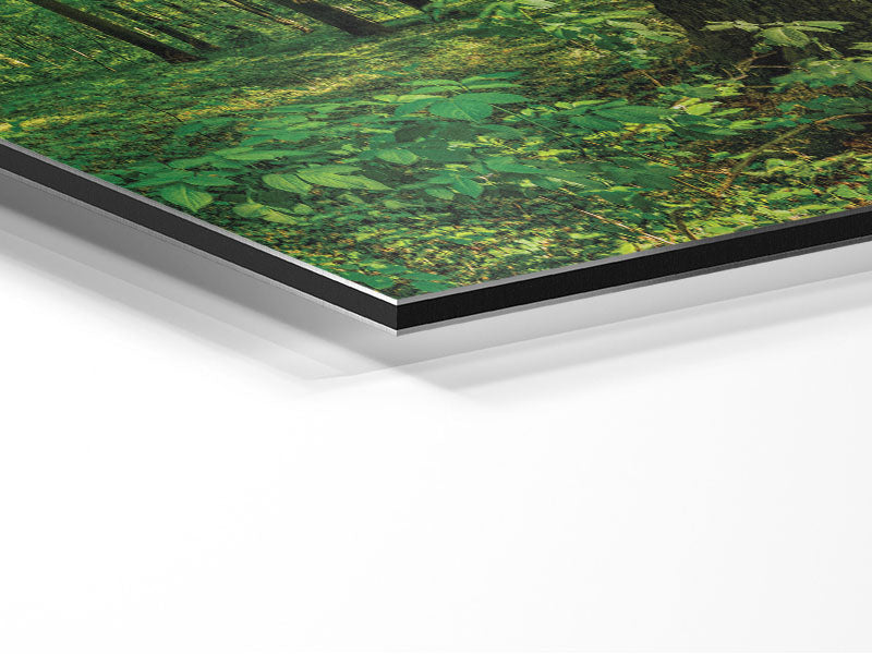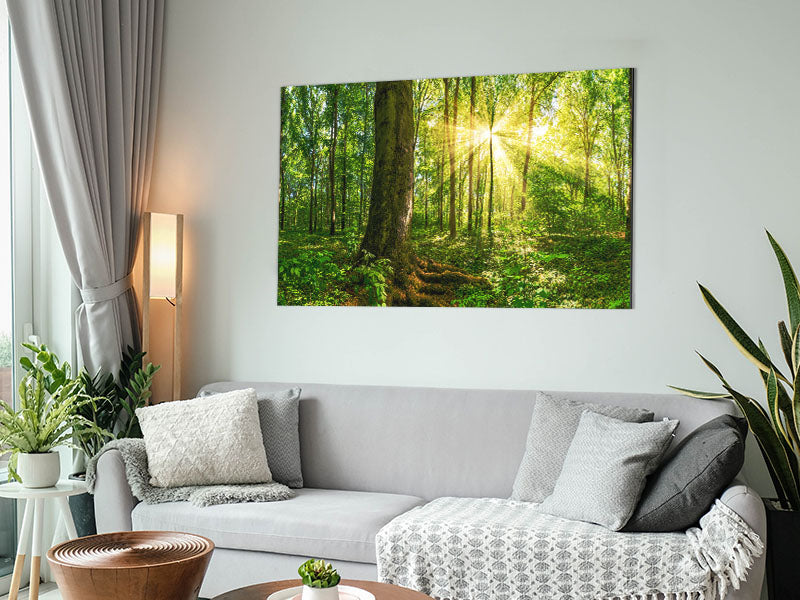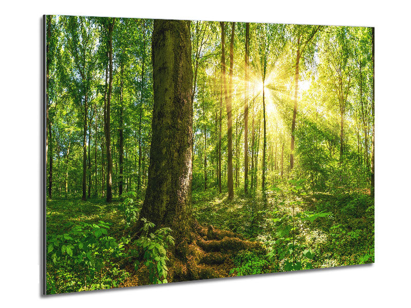 Bright light flare in the forest Printed on brushed aluminium dibond. A modern way to display art and easy to maintain.