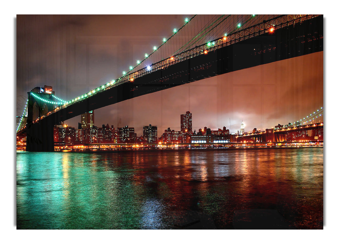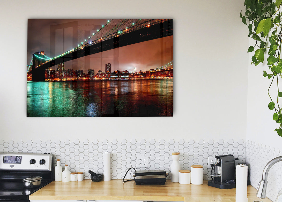 Brooklyn Bridge New York At Night acrylic print, UV printed onto 5mm thick acrylic glass. Comes with everything you need to hang on your wall.