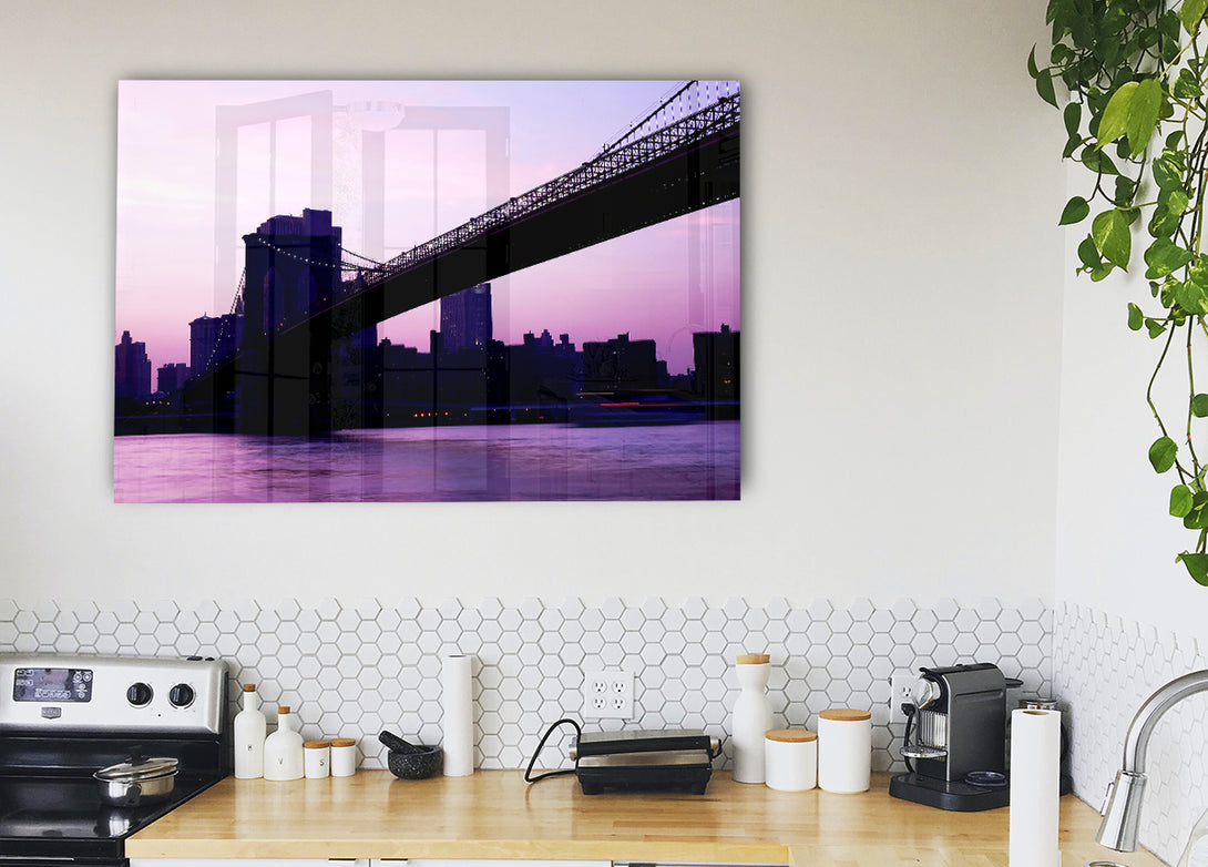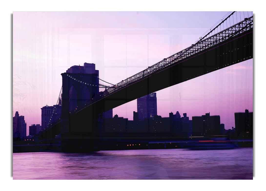 Brooklyn Bridge Purple Hue acrylic print, UV printed onto 5mm thick acrylic glass. Comes with everything you need to hang on your wall.