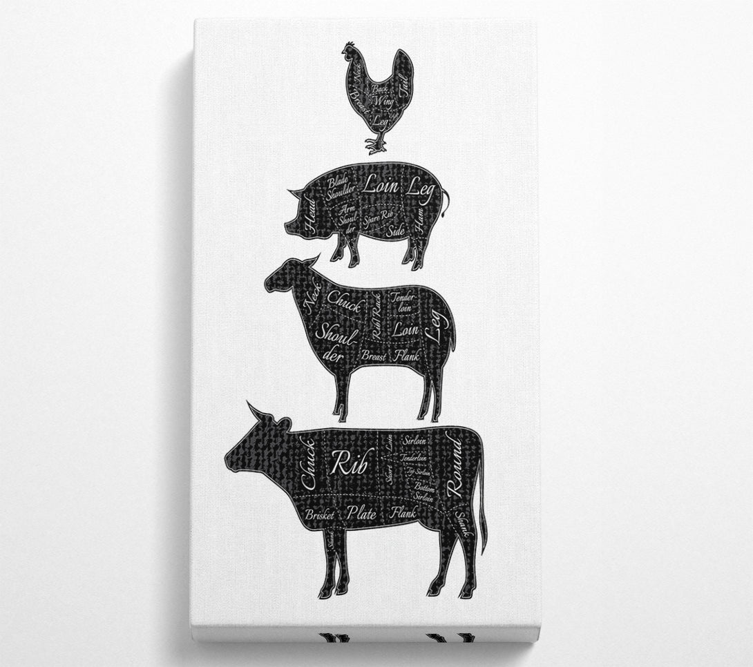 Butchers Selection 2 wide canvas, printed on coated polyester canvas. Mounted on to a 44mm box frame, ready to hang.