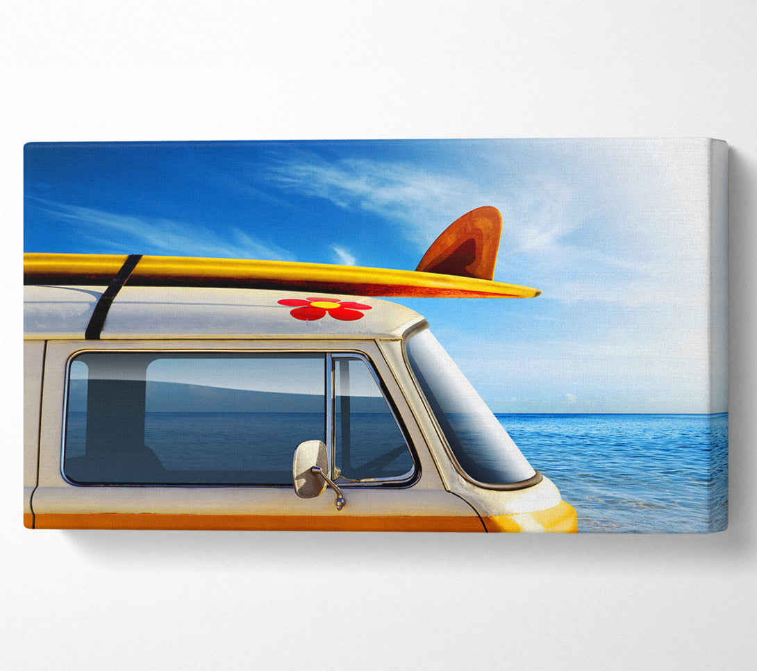 Camper Van Ready For The Waves wide canvas, printed on coated polyester canvas. Mounted on to a 44mm box frame, ready to hang.
