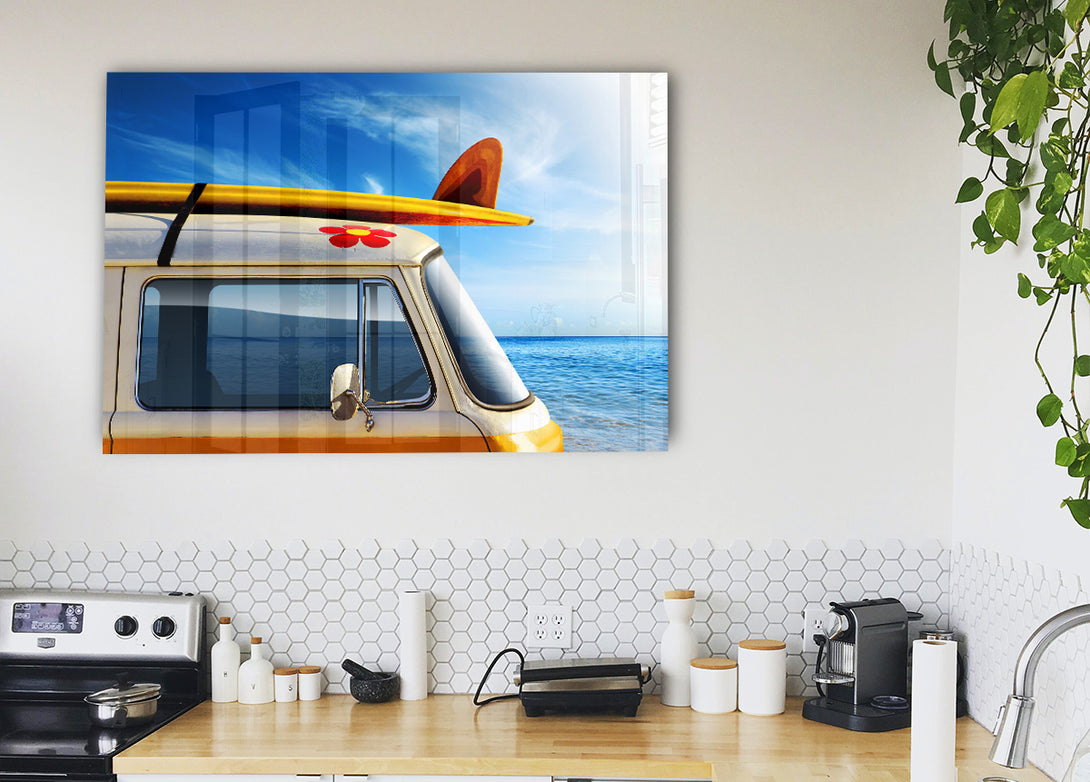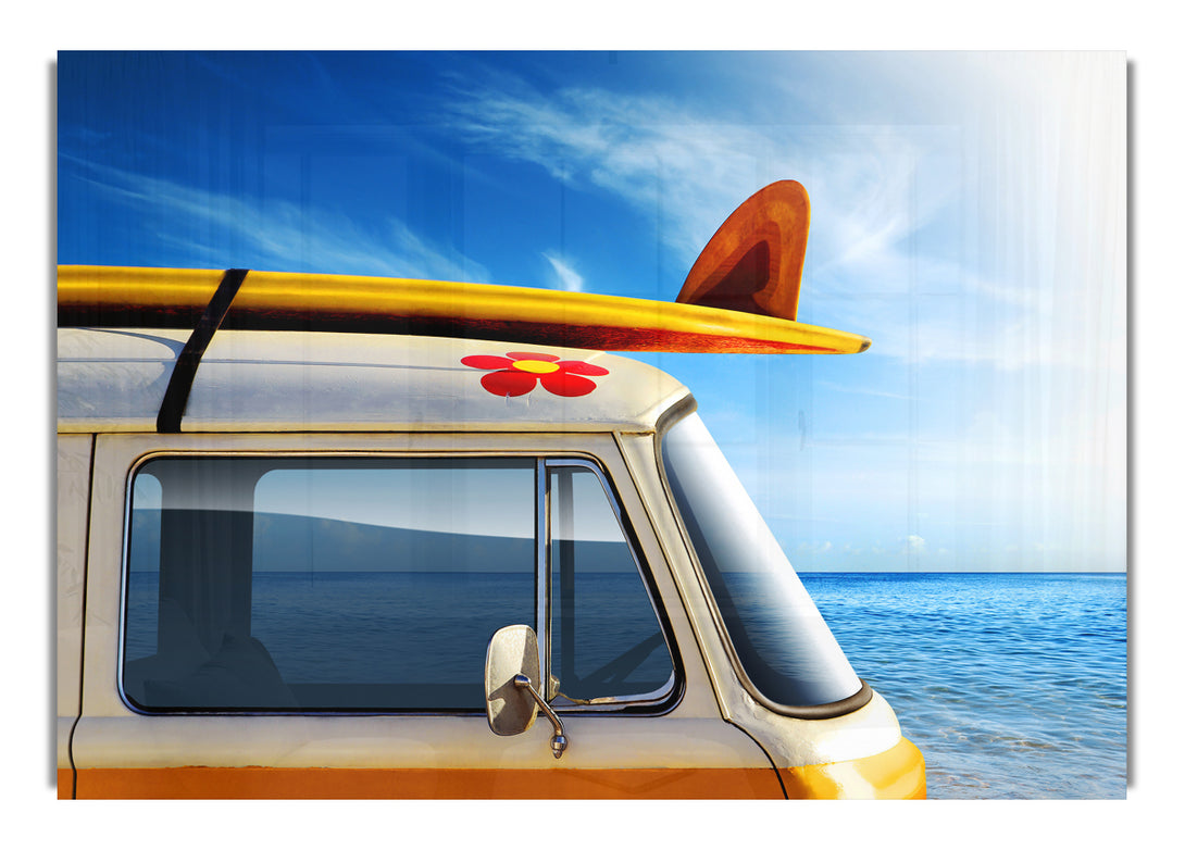Camper Van Ready For The Waves acrylic print, UV printed onto 5mm thick acrylic glass. Comes with everything you need to hang on your wall.