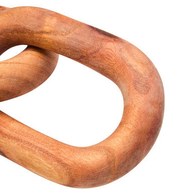 The two-link brown chain features an interplay of two contrasting shapes, offering visual interest to the space. Crafted from natural wood by skilled artisans, this minimalist sculpture's interlooping form and organic material make it ideal for coffee table styling, infusing the space with artisanal charm. *Please note that naturally occurring variations may occur in wood colour, texture and grain.