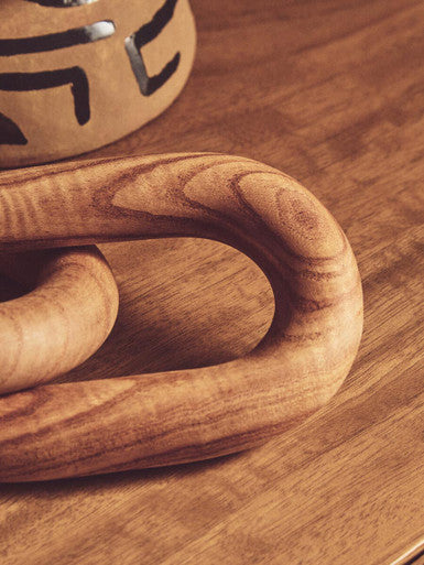 The two-link natural chain features an interplay of two contrasting shapes, offering visual interest to the space. Crafted from natural wood by skilled artisans, this minimalist sculpture's interlooping form and organic material make it ideal for coffee table styling, infusing the space with artisanal charm. *Please note that naturally occurring variations may occur in wood colour, texture and grain.