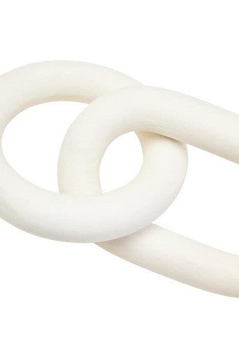 The two-link white chain features an interplay of two contrasting shapes, offering visual interest to the space. Crafted from natural wood by skilled artisans, this minimalist sculpture's interlooping form and organic material make it ideal for coffee table styling, infusing the space with artisanal charm. *Please note that naturally occurring variations may occur in wood colour, texture and grain.