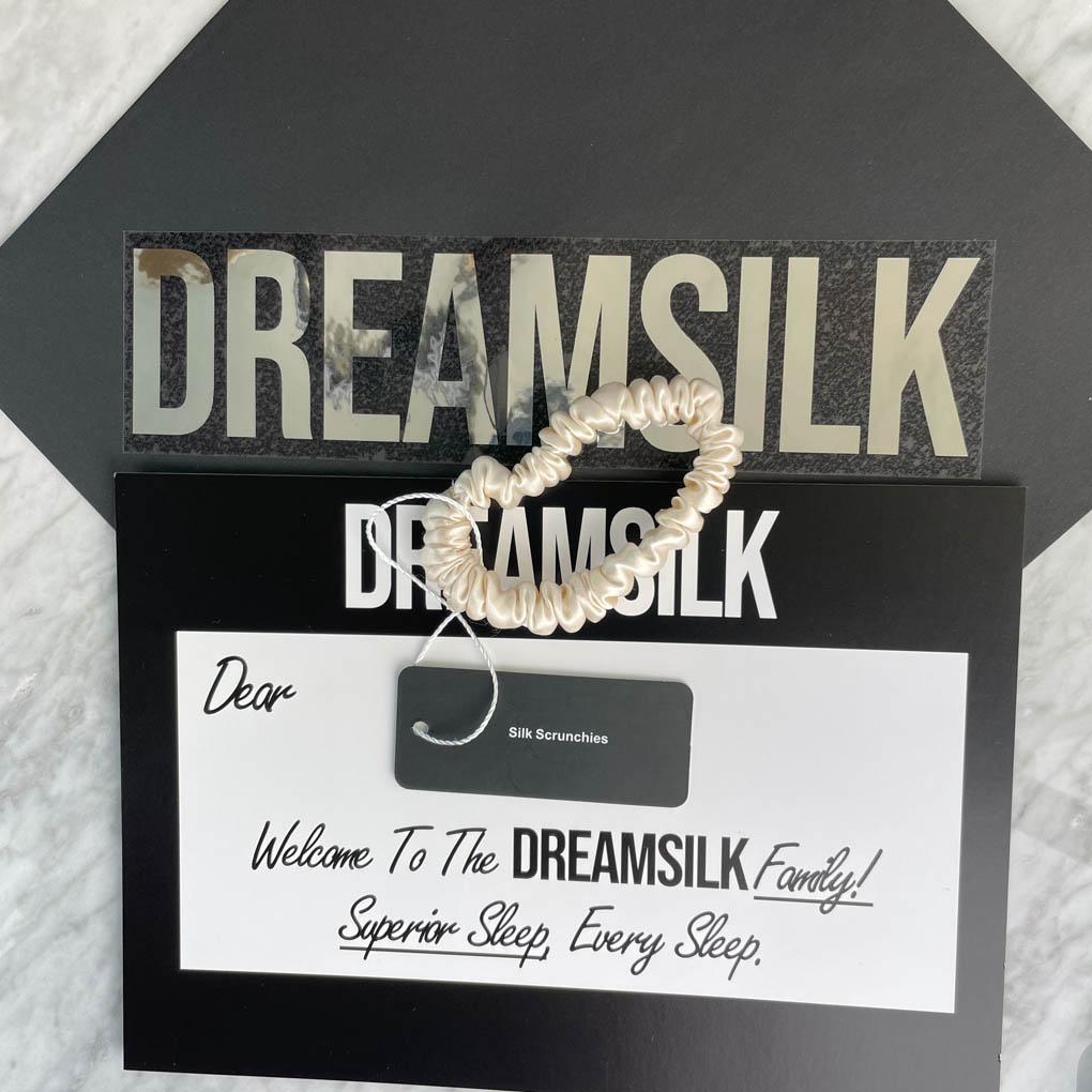 DREAMSILK's™ silk scrunchies that glide over your hair like moonlight over water.