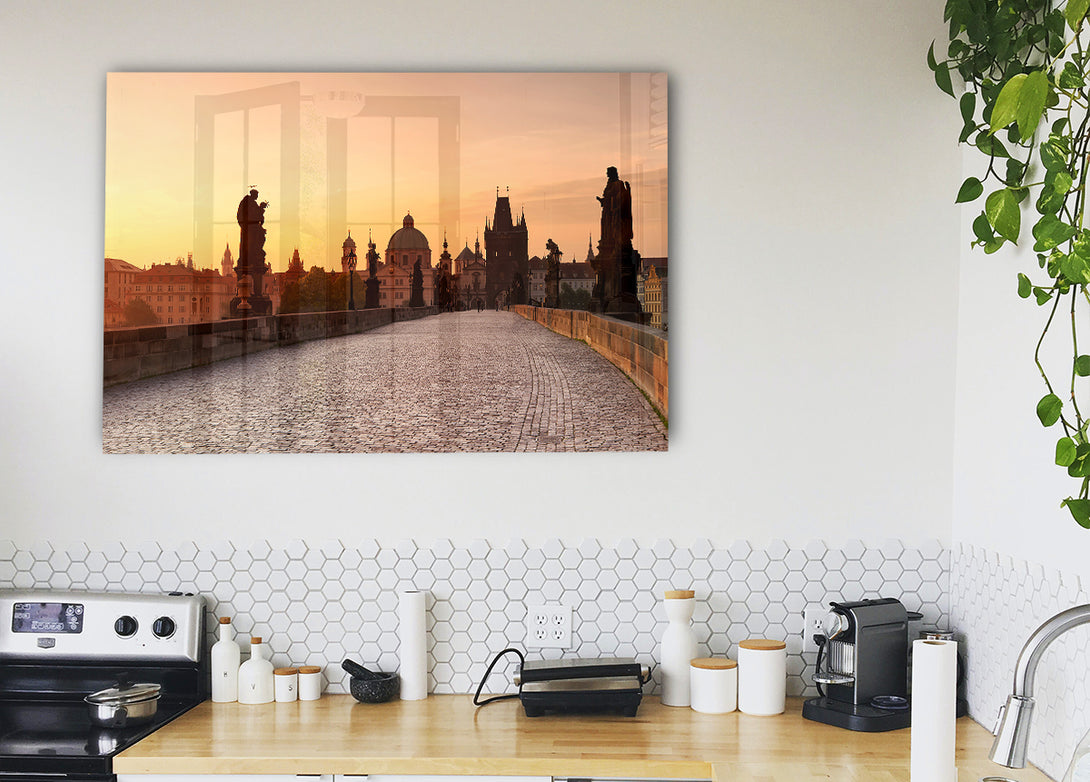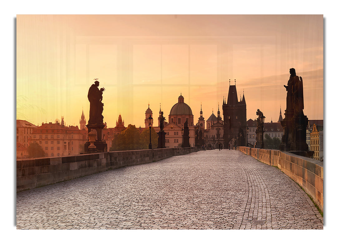Charles Bridge Morning Glow acrylic print, UV printed onto 5mm thick acrylic glass. Comes with everything you need to hang on your wall.