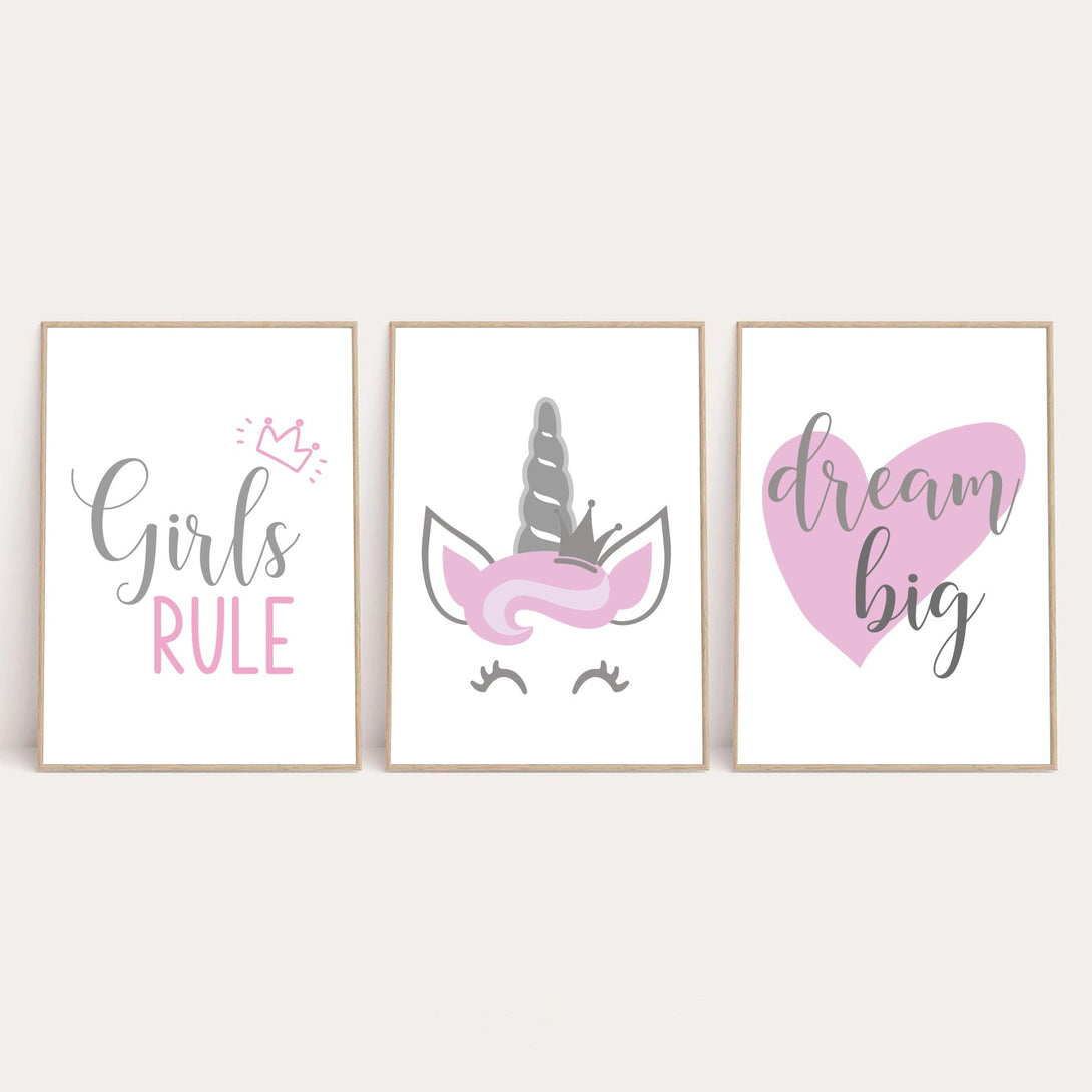 Children's Girl's Rule Unicorn Dream Big Bedroom Wall Decor Set Of 3 Prints