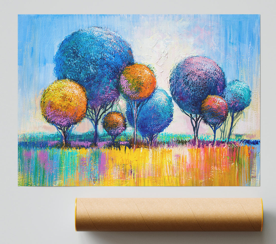 Our Circular Trees In The Meadow Poster is printed 260 GSM premium lustre paper that offers vibrant colours and exceptional detail.