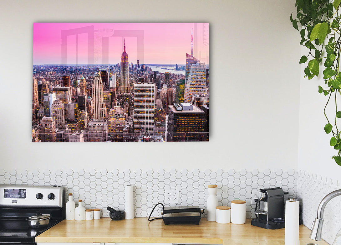 City In Pink acrylic print, UV printed onto 5mm thick acrylic glass. Comes with everything you need to hang on your wall.