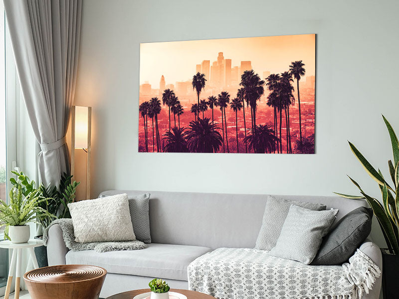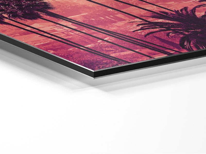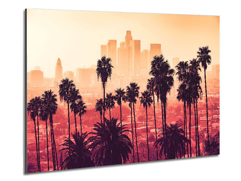 City Through The Palm Trees Printed on brushed aluminium dibond. A modern way to display art and easy to maintain.