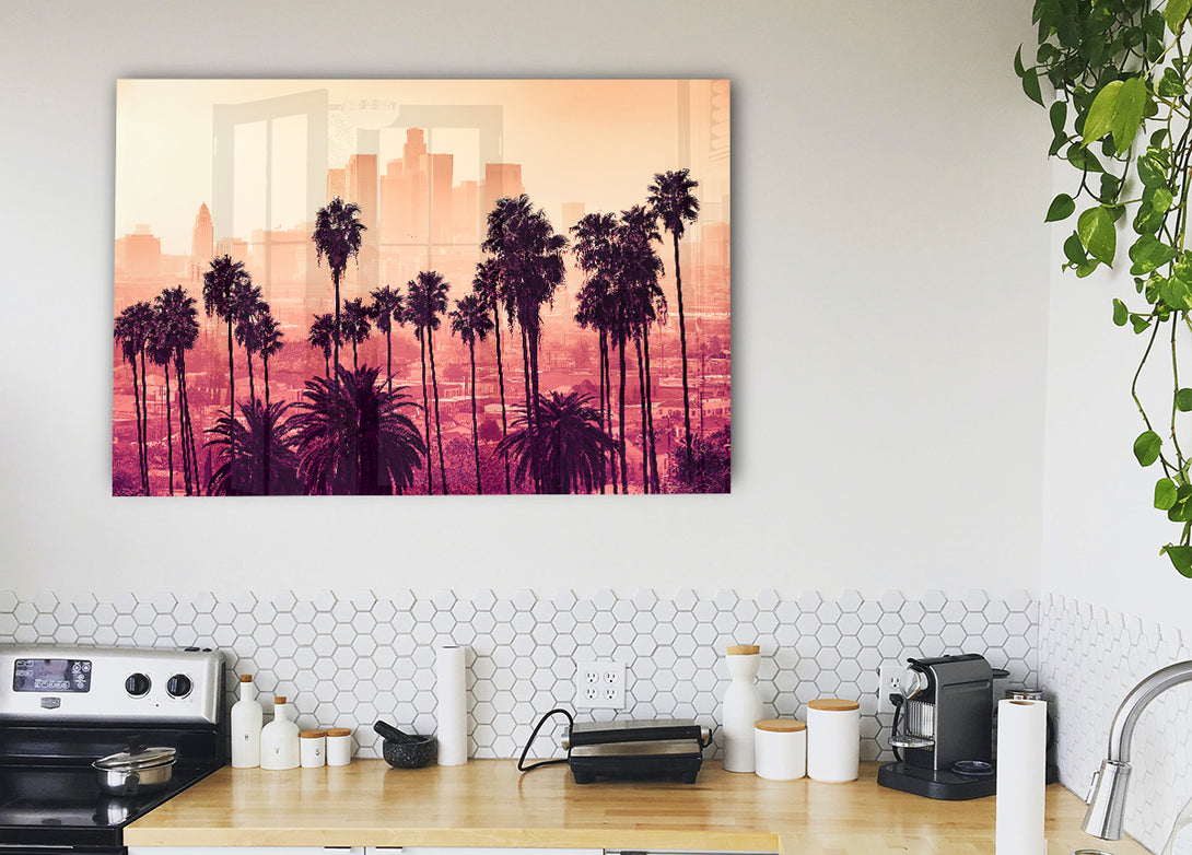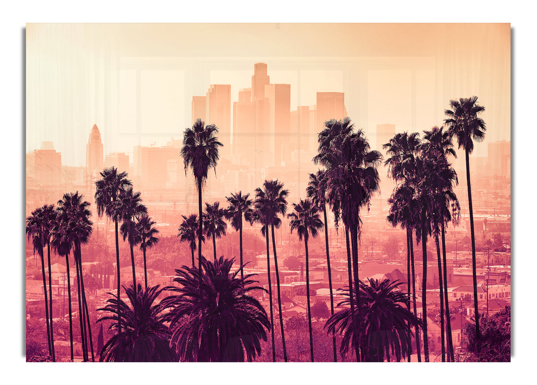 City Through The Palm Trees acrylic print, UV printed onto 5mm thick acrylic glass. Comes with everything you need to hang on your wall.