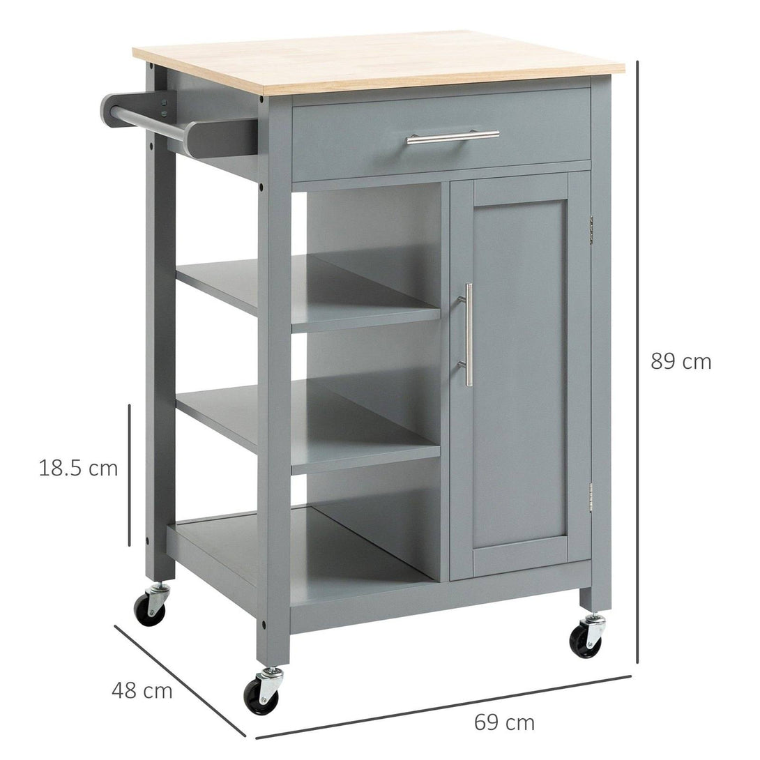 Organise your kitchen in a cool, retro aesthetic with this grey rolling cart from HOMCOM. The frame, made from MDF, is durable and reliable for everyday use and features three open side shelves, a cupboard, a top drawer and a side hanging rail (for towels). There's a wooden countertop for a solid preparation area. Comes complete for four wheels to roll around easily - two can be locked to stand safely still.