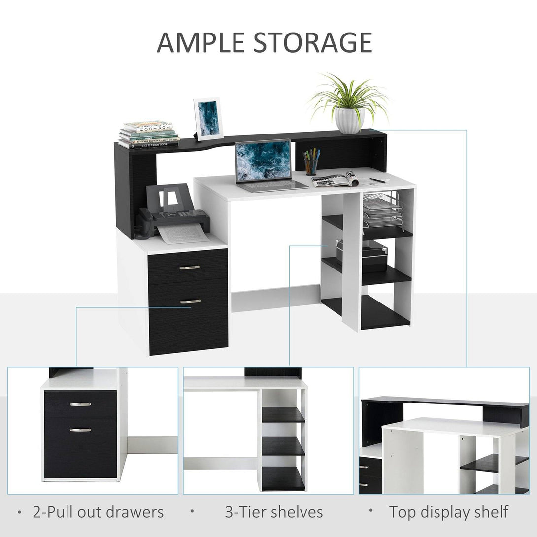 This HOMCOM study desk with storage combines contemporary design with highly efficient storage capabilities. A vertical platform with multiple shelves sits opposite 2 easy glide drawers with metal sliding rails and aluminum alloy handles. With a printer shelf and several bookshelves, in addition to a large surface space to ensure that you'll never run out of room for all your desktop essentials. Increase your productivity and peace of mind with the latest office furniture offering from HOMCOM.