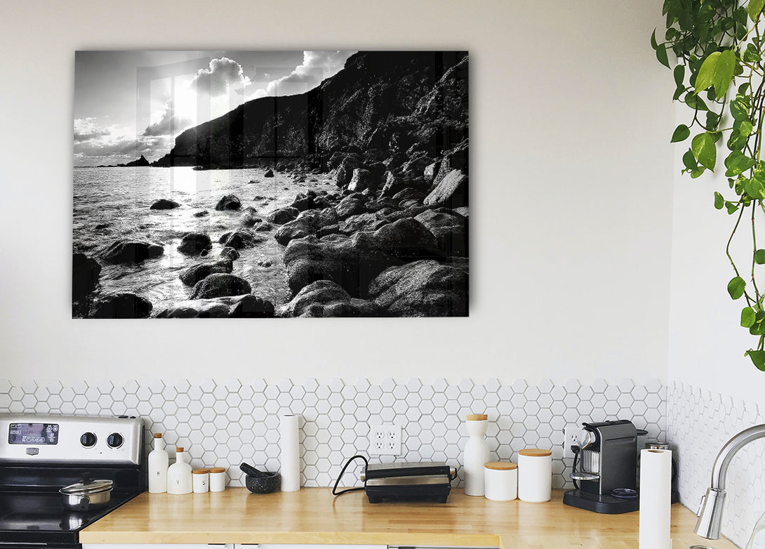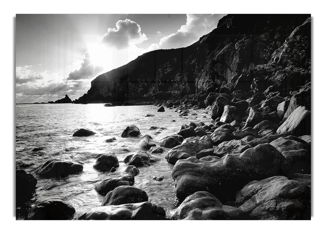 Cornwall Waters B~w acrylic print, UV printed onto 5mm thick acrylic glass. Comes with everything you need to hang on your wall.