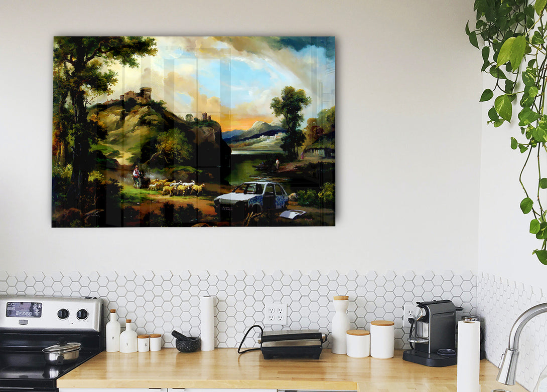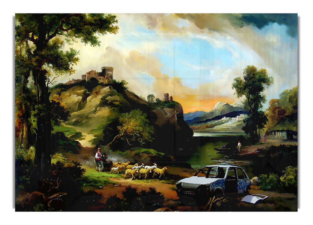 Countryside Junk Yard Banksy Canvasb L acrylic print, UV printed onto 5mm thick acrylic glass. Comes with everything you need to hang on your wall.