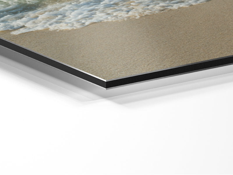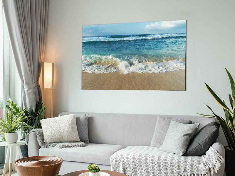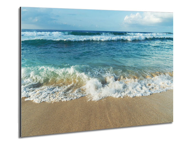 Crashing waves on the sandy beach Printed on brushed aluminium dibond. A modern way to display art and easy to maintain.