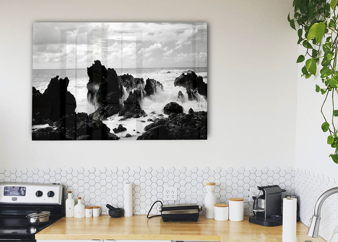 Crashing Waves Over Rocks B~w acrylic print, UV printed onto 5mm thick acrylic glass. Comes with everything you need to hang on your wall.
