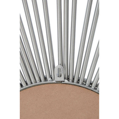 This wall mirror is a stylish statement piece and features a decorative sunburst pattern in a silver finish. The mirror rests in a metal sphere that adds dimension to the design and forms a tonal contrast with the asymmetric metal spokes.