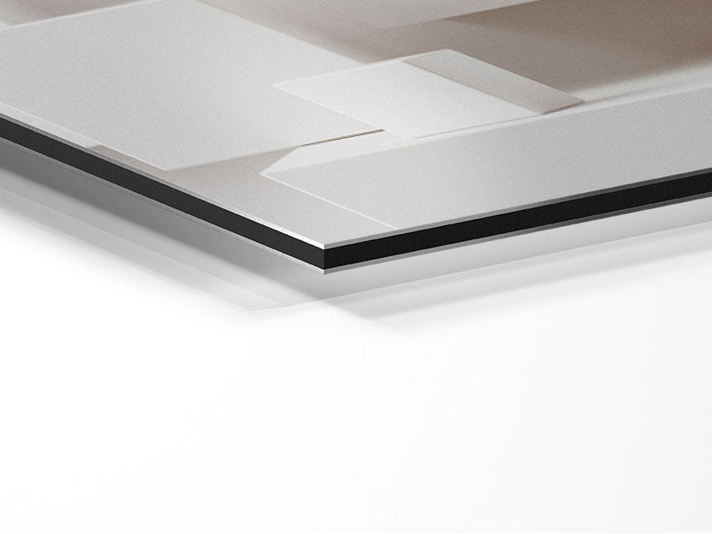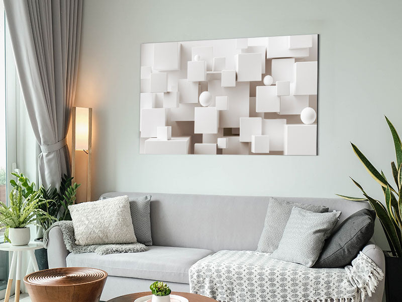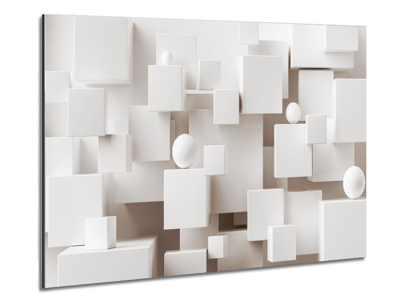 Cubes And Spheres White Printed on brushed aluminium dibond. A modern way to display art and easy to maintain.