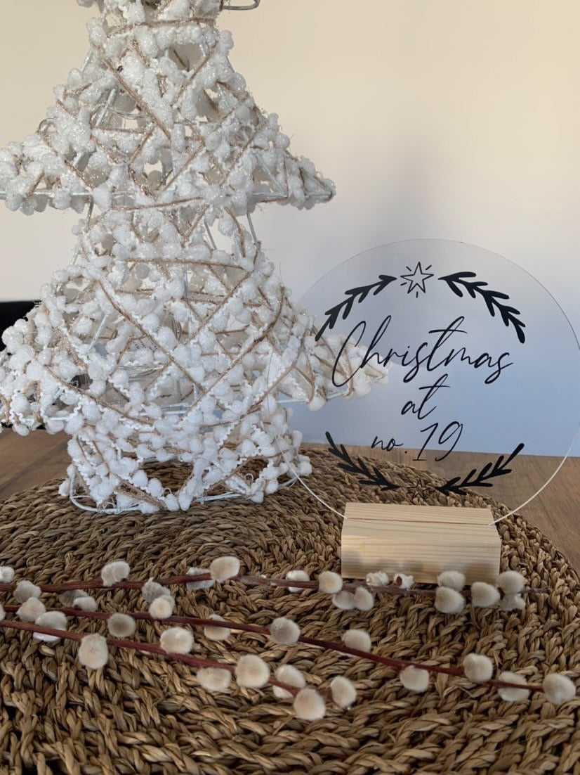 PREMIUM ACRYLIC WITH STURDY WOODEN BASECrafted from clear, high-quality acrylic, this sign is securely set into a solid wooden block base for a freestanding design. The plaque is firmly glued in place, ensuring stability and durability throughout the holiday season.
