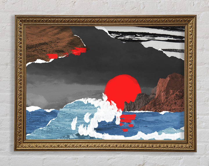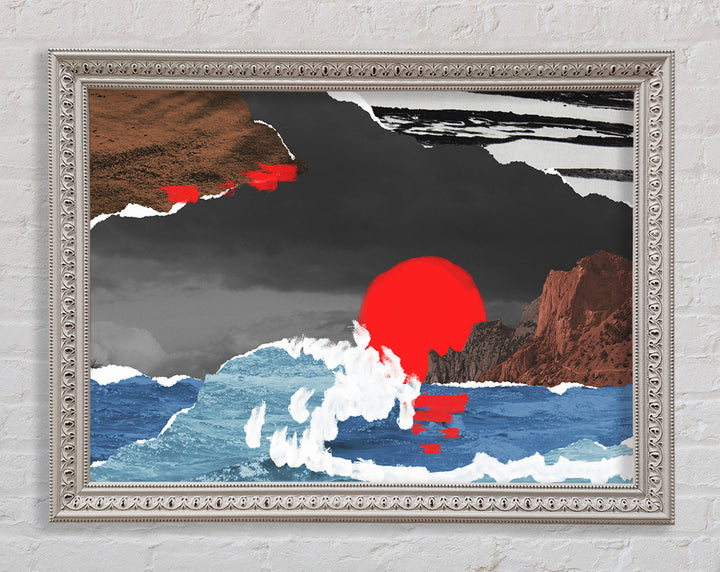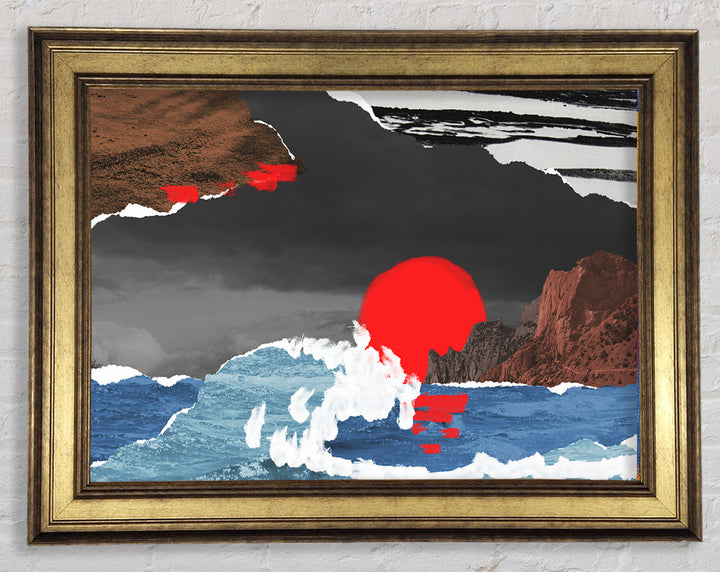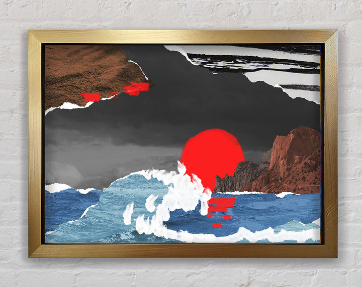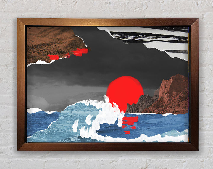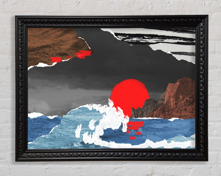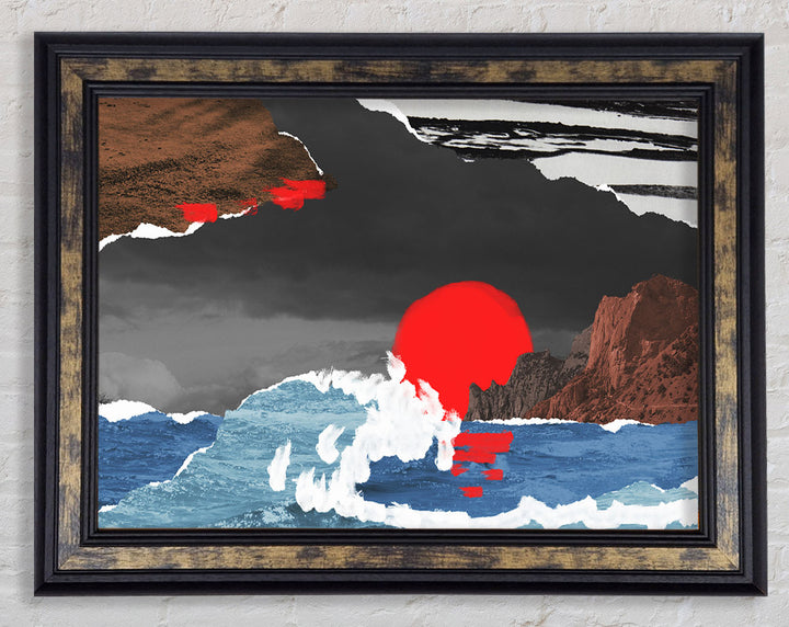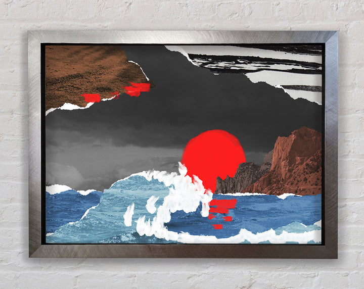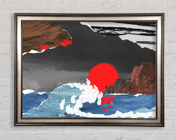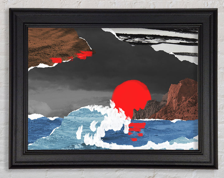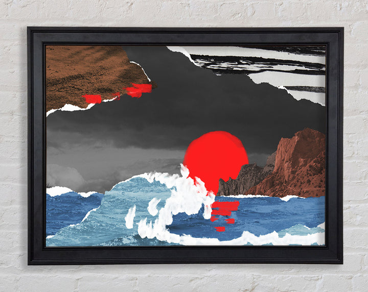 Cut Out Mountain Ocean Red Sun Framed Print