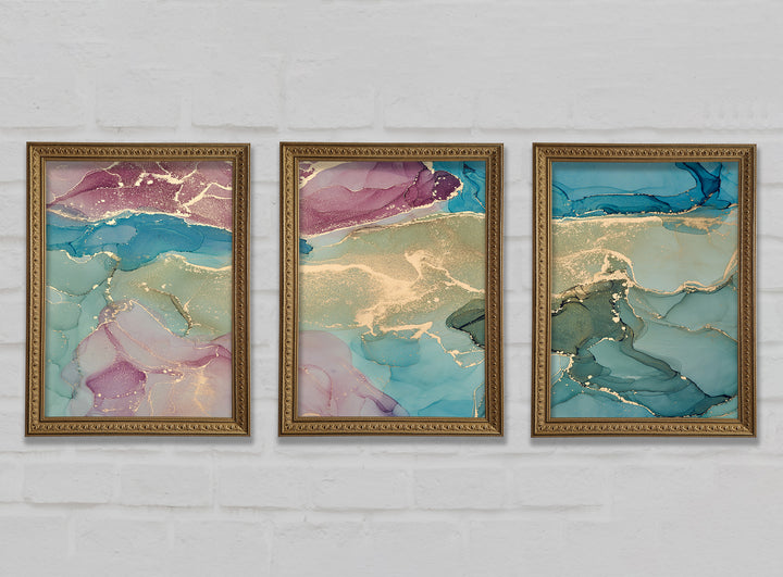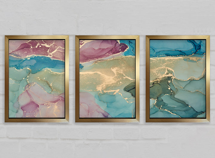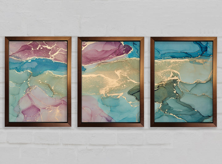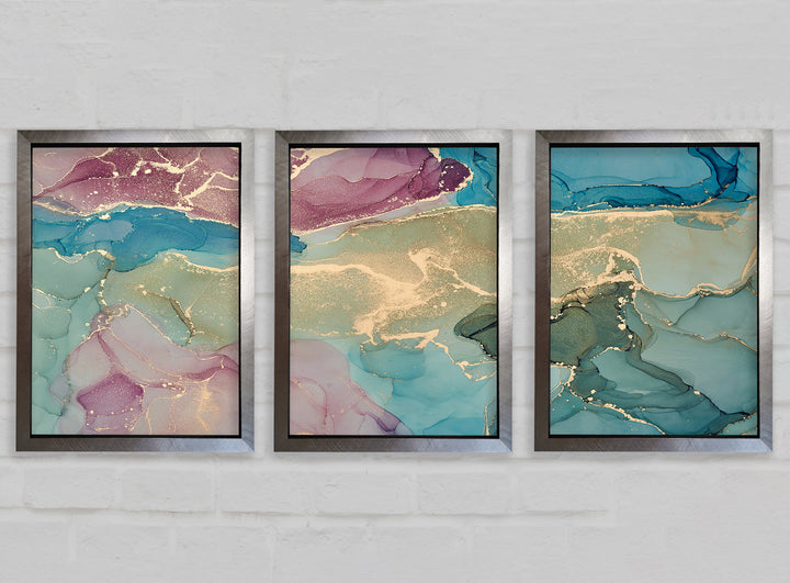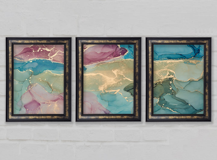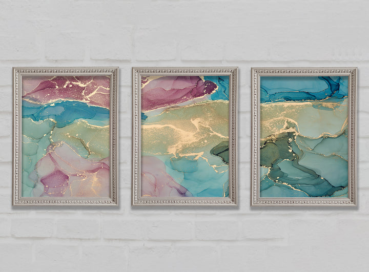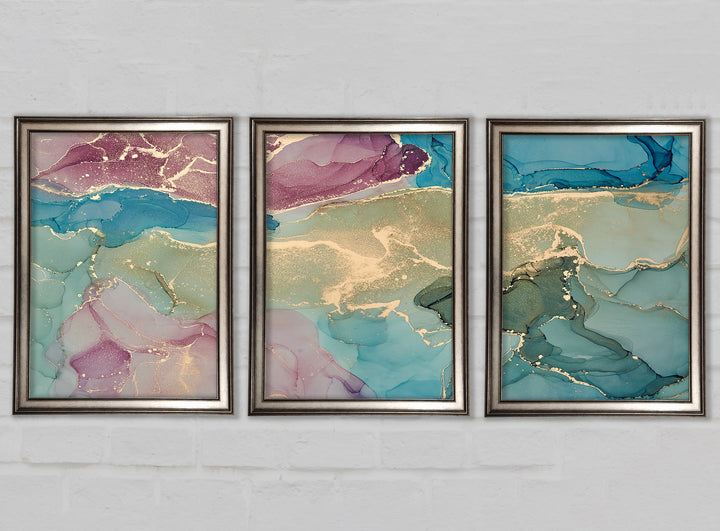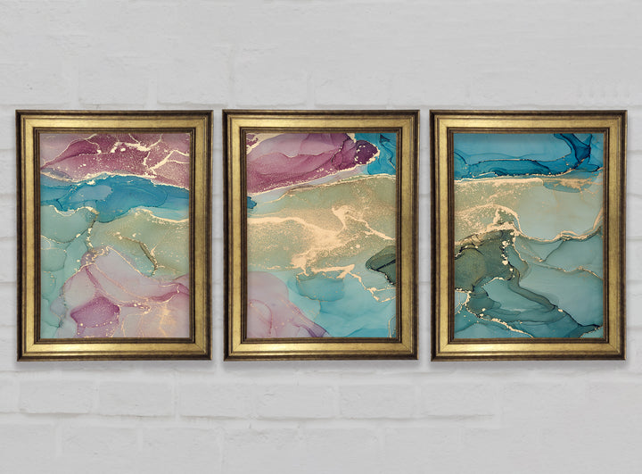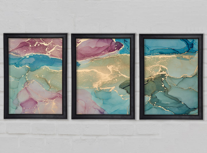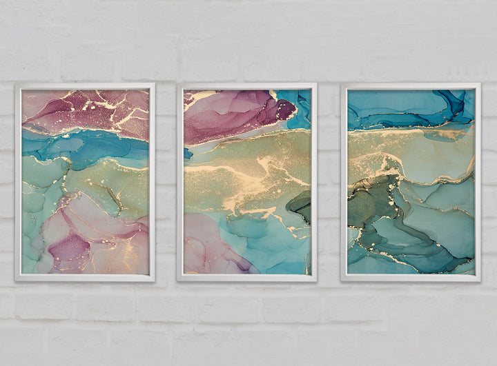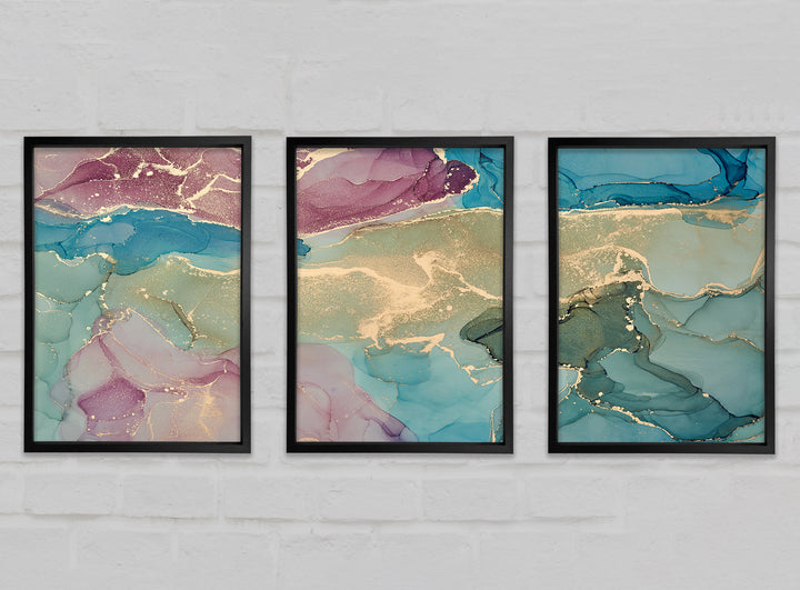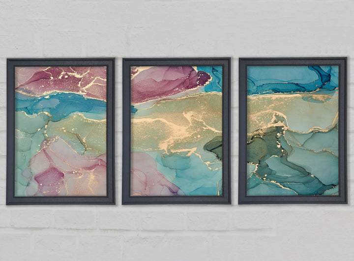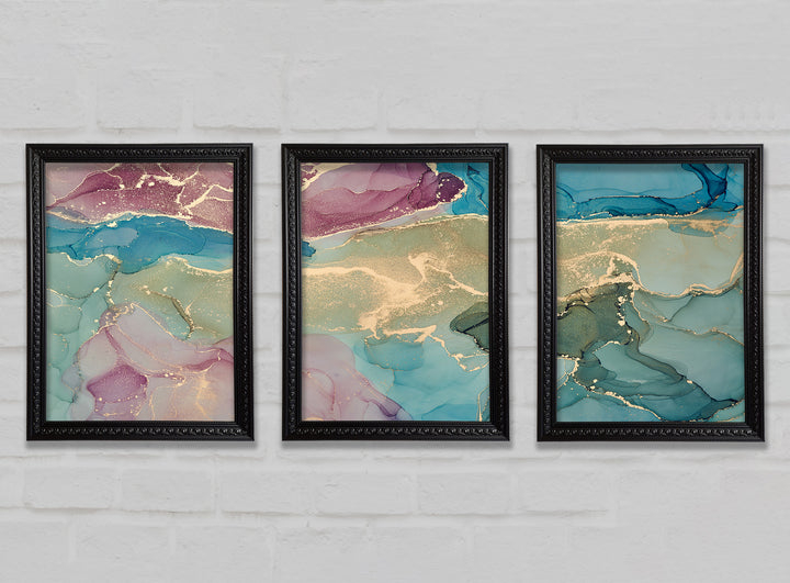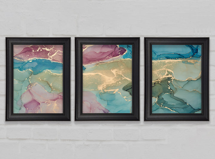 Deep Blue Glitter set of 3 framed print wall art, available in mutiple frame colours. Ready to hang from the box and handmade in the United Kingdom.