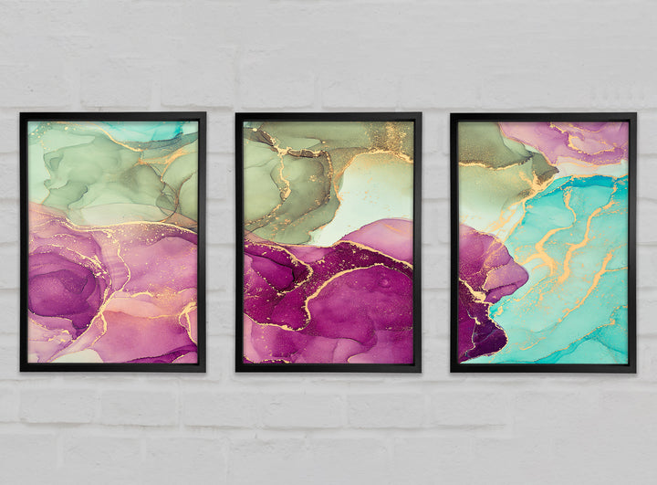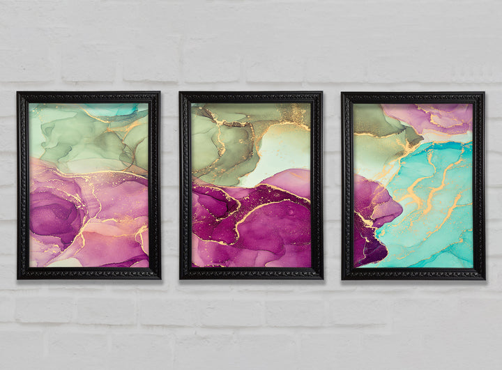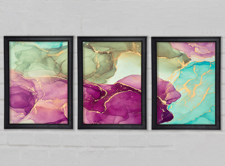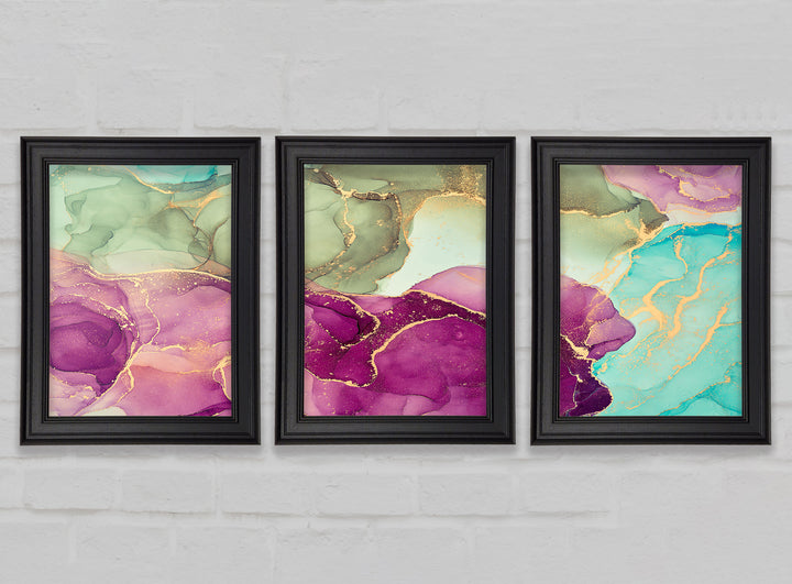Deep Purple Glitter set of 3 framed print wall art, available in mutiple frame colours. Ready to hang from the box and handmade in the United Kingdom.