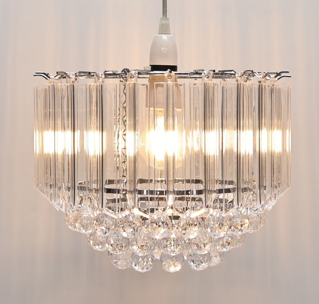 Add a touch of glamour to your ceiling with the Demi Clear And Chrome Easy-Fit Pendant, exclusive to Pagazzi Lighting. This dazzling design features a striking tiered arrangement, starting with a row of elegant clear prisms, cascading into three lower tiers of clear facetted glass spheres—each one cut to catch and reflect the light beautifully.
