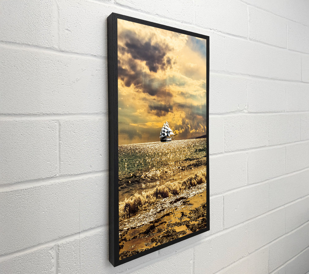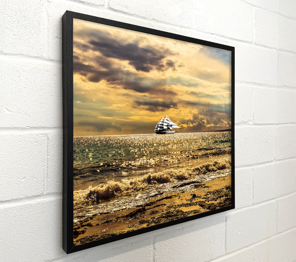 Distant White Ship On Golden Sea