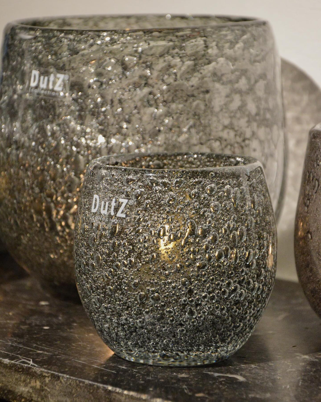 DIVA HURRICANE: The DutZ design vases are special glass objects, made with artisan dedication and traditional skills. These Divas Hurricanes sparkle! A mixture of metal chips and bubbles inside the glass give these pots a glow like you've never seen. Put a candle inside and the Divas will brighten up any home or garden. They are perfect as a tealight or candleholder. Or put a plant inside and enjoy the Divas on a table or windows sill. This product contains metal chips and the surface may sometimes be a little rough as a result. These characteristics are part of the product and make each item unique!